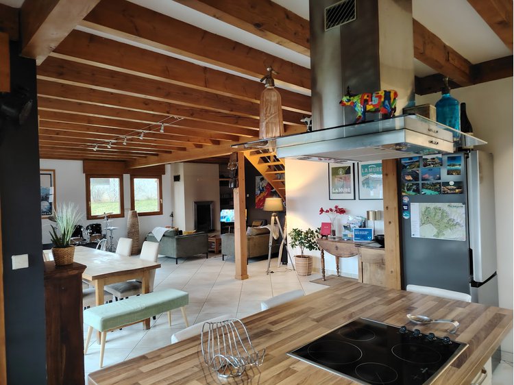 Vous disposerez d'une vaste terrasse abritée avec salon de jardin, hamac, coin bar et plancha pour vos grillades. Belle pièce de vie avec cuisine toute équipée (lave-vaisselle, four, congélateur, micro-ondes...), séjour ouvrant sur la terrasse, salon avec cheminée, wc, salle d'eau, buanderie (lave-linge).