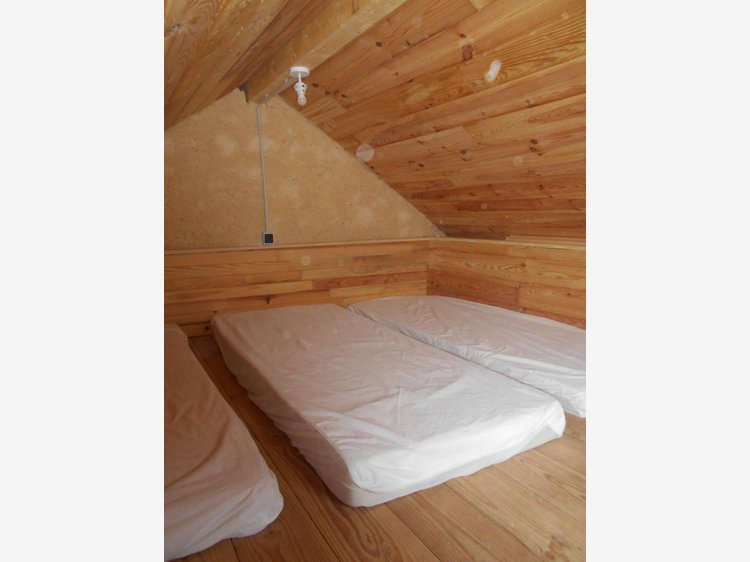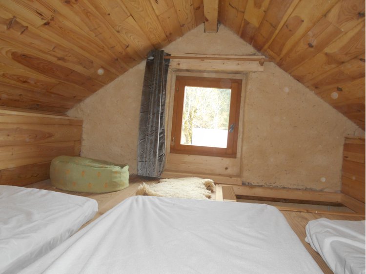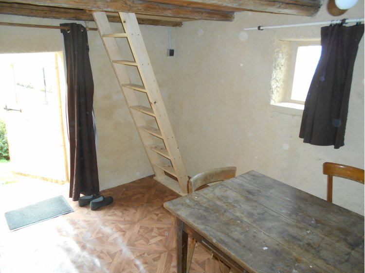 En rez-de-chaussée une table et des chaises et un couchage type "bat-flanc". A l'étage 3 places de couchage (matelas posé sur le plancher).