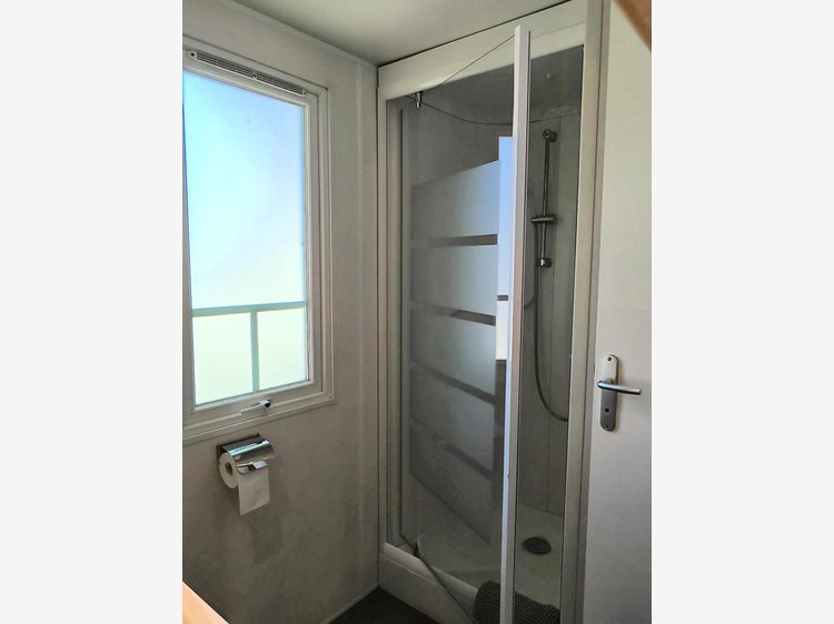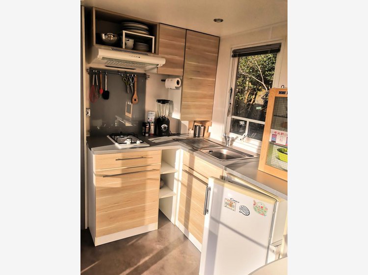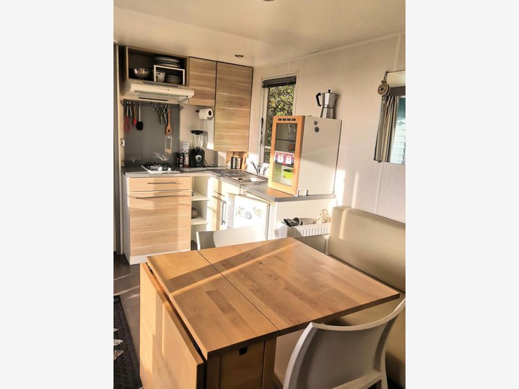 Pièce de vie espace cuisine entièrement équipé (micro-ondes, cafetière filtre et expresso, grille-pain, frigo, congélateur) ch.1 (Lit double et salle d'eau-wc), ch.2 (2 lits 80x190, salle d'eau-wc).