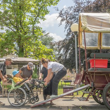 - balade en calèche : la calèche permet de constituer un groupe de résident(e)s et de partir ensemble en balade. L'intérieur de la calèche est propice à la discussion, le mouvement éveille les sensations corporelles, la déambulation en calèche attire l'attention des passants et incite à recréer du lien avec l'extérieur de l'établissement.